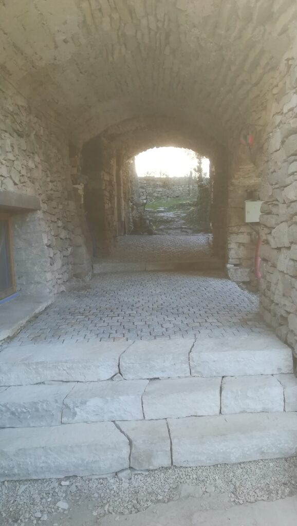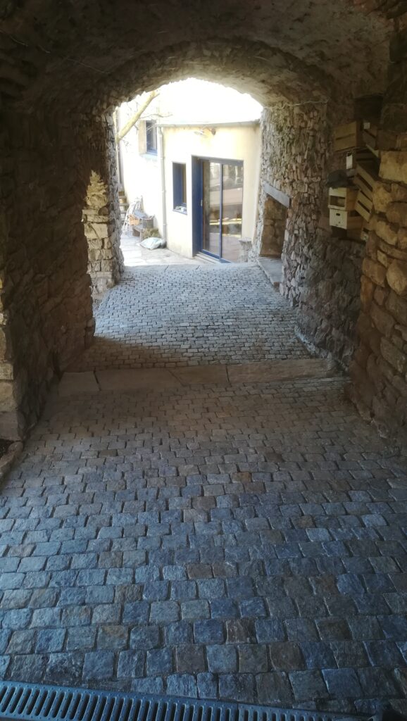 Pavage en gneiss du Caroux et marche d’escalier en pierres de Sauclière.